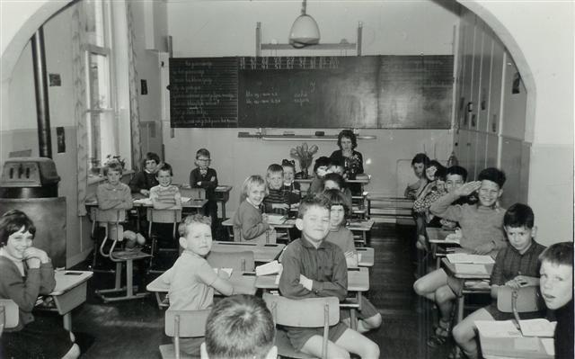 Klas 1 van de School met de Bijbel, in de het oude gebouw aan het dorpsplein.