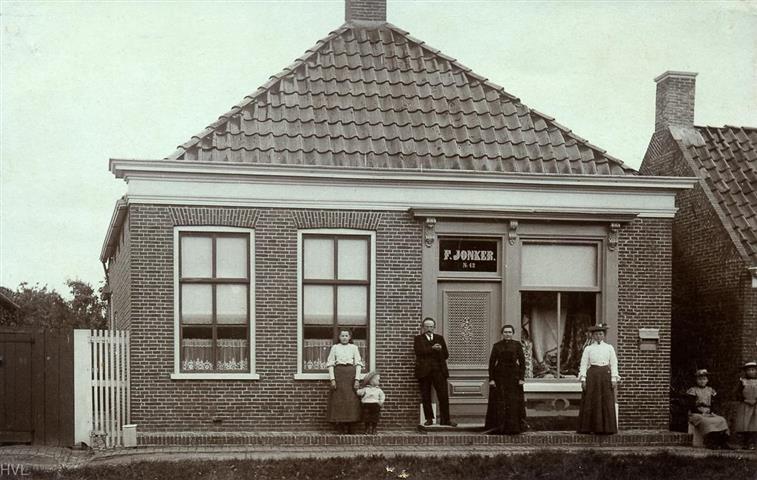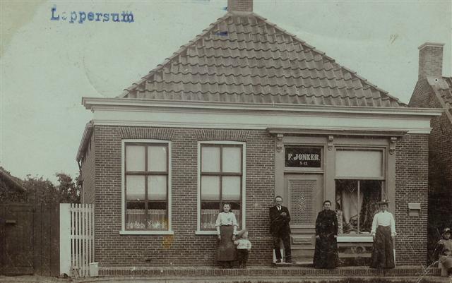 Op onderstaande ansichtkaart staan Fredericus Jonker en zijn vrouw Jantje Pilon voor de winkel in Loppersum. Boven de deur 'F. Jonker, No. 42'.