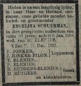 Engelina Schuurman verhuist van Pieterburen en wordt ingeschreven in het bevolkingsregister van Uithuizermeeden 1859-1869, als 'gehuwd, komende uit de gemeente Eenrum'.