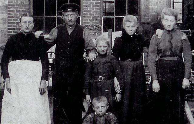Helemaal links staat Grietje Werkema voor de smederij bij Vierverlaten, daarnaast haar man en drie dochters.
