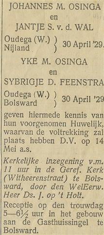 1929 trouwadvertentie Johannes Osinga (1894-1974) en Jantje van der Wal (1902-1997)