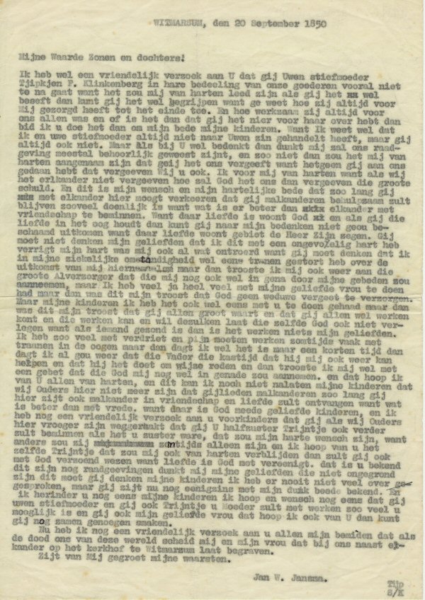 20.9.1850 verzoek van Jan Wybrens Jansma aan zijn kinderen: