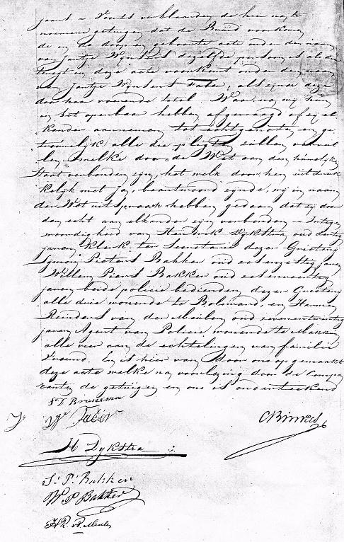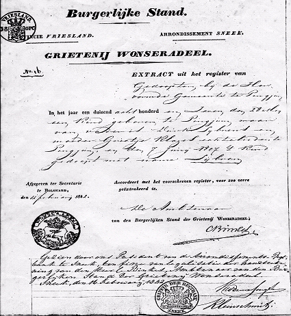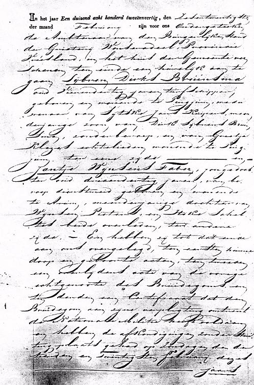 In het jaar 1842 den 26 februari zijn voor ons verschenen ten einde een huwelijk aan te gaan, Sijbren Dirks Bruinsma, oud 34 jaren turfschipper, geboren en wonende te Pingjum, weduwnaar van Sijtske Jans Kuipers, meerderjarige zoon van Dirk Sijbrens Bruinsma, zonder beroep en van Grietje Klazes echtelieden wonende te Pingjum ten ene zijde en Jantje Wijnsens Faber, jongedochter oud 33 jaren, van beroep dienstmeid,geboren en wonende te Arum, meerderjarige dochter van Wijnsen Pieters en Itske Scheltes, beide overleden, ten andere ziide. En hebben zij tot dat einde aan ons overlegd, ten eersten hunnen doop en geboorte acten ten tweede een overlijdens acte van de vorige echtgenote des Bruidegoms en ten derde een certificaat dat den Bruidegom aan zijne verplichting omtrent de Nationale Militie heeft voldaan en hebben de afkondigingen zonder zitting plaats gehad op zondagen den dertiende en twintigste februari dezes jaars.Voorts verkaarden de hun na te noemen getuigen dat de Bruid voorkomende de doop en geboorte acte onder den naam van Jantje Wijnsens dezelfde persoon is als die teregt in deze acte voorkomt onder den naam Jantje Wijnsens Faber, als zijnde deze door haar voerende titel. Waarna mij hun in het openbaar hebben afgevraagd of zij elkander aannemen tot echtgenoten en getrouwelijk alle pligten te zullen vervullen welke door de wet aan deze huwelijke staat verbonden zijn, het welk door hen uitdrukkelijk met ja beantwoord zijnde mij in naam der wet uitspraak hebben gedaan dat zij in de echt aan elkander zijn verbonden en in tegenwoordigheid van Hendrik Dijkstra oud dertig jaren klerk ten secretarie dezen Grietenij, Sijmon Pieters Bakker oud zes en zestig jaren, Willem Pieters Bakker oud zes en veertig jaren beide policie bedienden dezen Grietenij alle drie wonende te Bolsward en Harmen Reinders van den Meulen oud zevenentwintig jaren agent van Policie wonende te Makkum alle vier aan de echtelingen van familie vreemd. Er is hier van door ons opgemaakt deze acte.