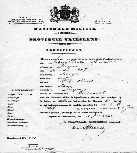 Certificaat voor Siebren Dirks Bruinsma, dat hij voor de Nationale Militie is ingeschreven, dat aan hem vervolgens bij loting van 7226 is ten deel gevallen het Nummer 43, dat hij op het trekkingsnummer is ingelijfd bij de Inf. En de tijd van meer dan drie jaren hebbende gediend, behoorlijk uit de dienst ontslagen is: 13 januari 1842.