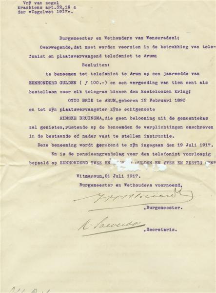 1917 de benoemingsbrief als 'telefonist' in Arum