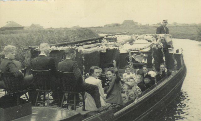zo vlak na de oorlog niet in auto's maar met de boot naar het stadhuis in Witmarsum