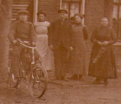 Van links naar rechts: onbekende fietser, Grietje (vermoedelijk), vader Wiert Jan, Rika (vermoedelijk) en moeder Grietje