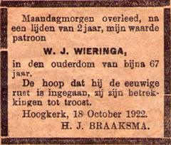 Wiert Jans Wieringa overlijdt in 1922. Notaris Offerhaus in Groningen stuurt de rekening van de boedelscheiding.