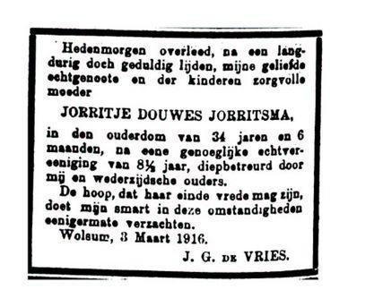 overlijdensbericht van Jorritje Douwes Jorritsma (1881-1916)