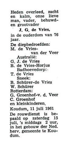 overlijdensbericht van Jacob de Vries (1885-1961)