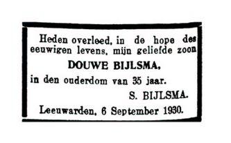 overlijdensbericht van Douwe Bijlsma (1895-1930), enige zoon van