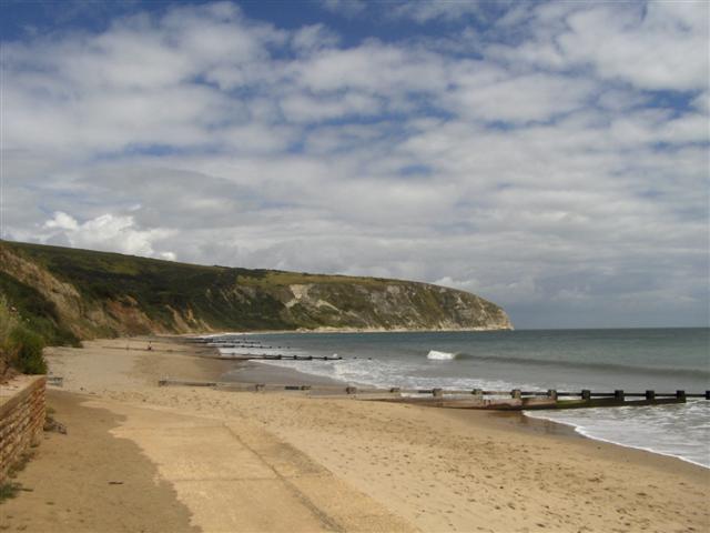het strand voor Swanage met zicht op de klif met de 'Old Harry Rocks'