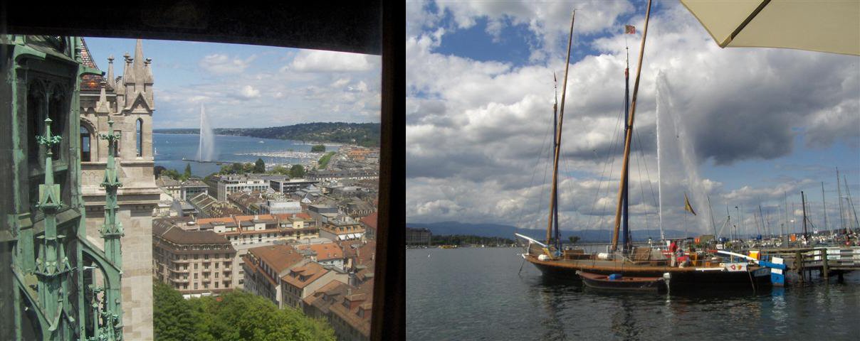 zicht op het meer van Genève vanuit een toren van de Kathedraal St Pierre -en vanaf een terrasje aan de waterkant