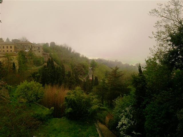Aan de rand van Volterra: mist en doorbrekende zon.